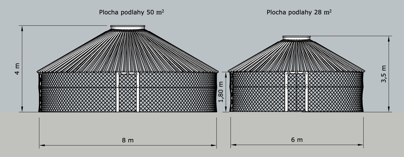 Naše jurty nabízíme ve dvou velikostech, a to o průměru 6 a 8 metrů.